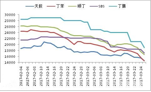 如上表可见,丁苯、顺丁跌幅最大,分别为40.33%和35.52%,其次是丁腈、天胶,跌幅也达34.48%和30.38%,SBS市场跌幅相对较小。
